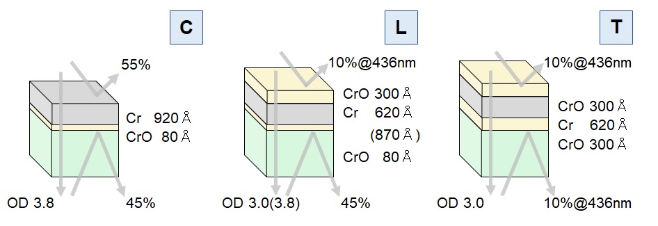 Cr単層膜(図中C)、低反射2層膜(図中L)、表裏面低反射3層膜(図中T)等々。膜厚や光学特性は御希望に応じて変更、調整が可能です。